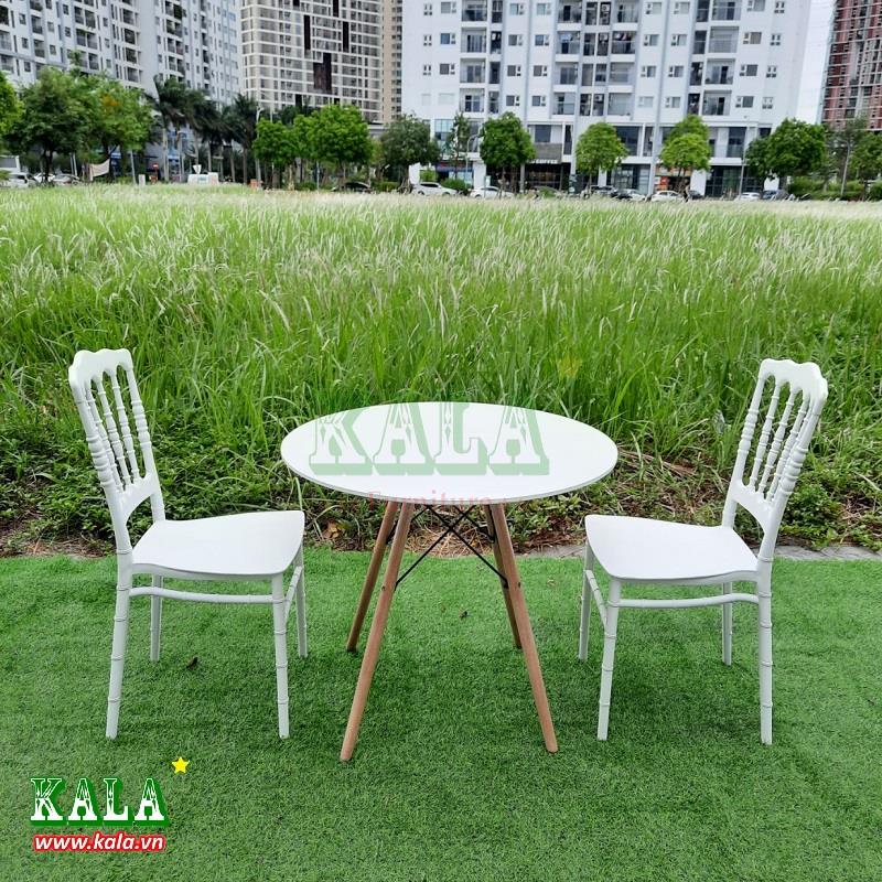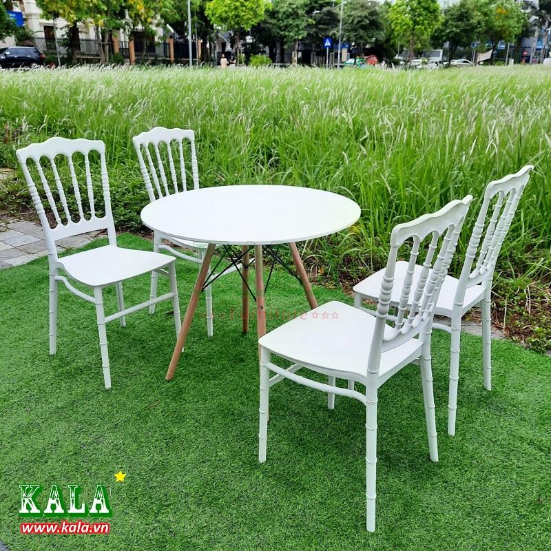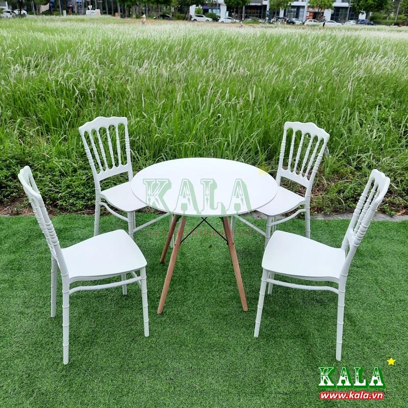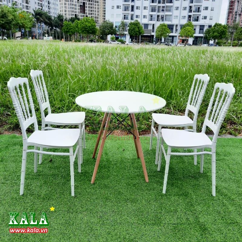 Bàn ghế màu trắng dùng cho ngoài trời sẽ làm nổi bật không gian xung quanh, mang sự tươi mới, sáng sủa, hiện đại. Bộ bàn ghế ăn được kết hợp từ mẫu ghế sự kiện và bàn Eames tròn 80cm vô cùng rộng rãi, thoải mái cho người ngồi.