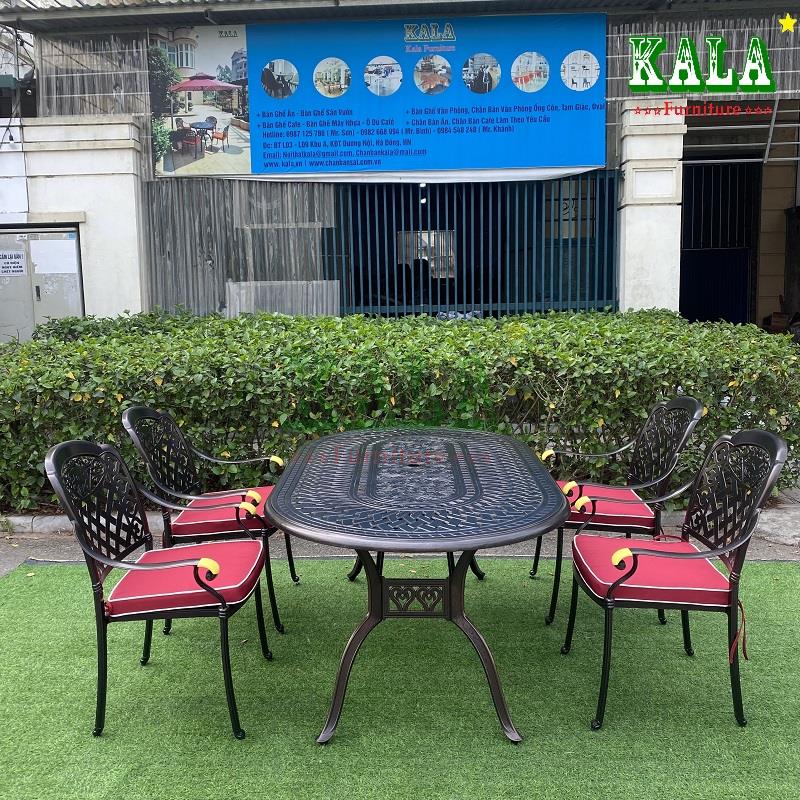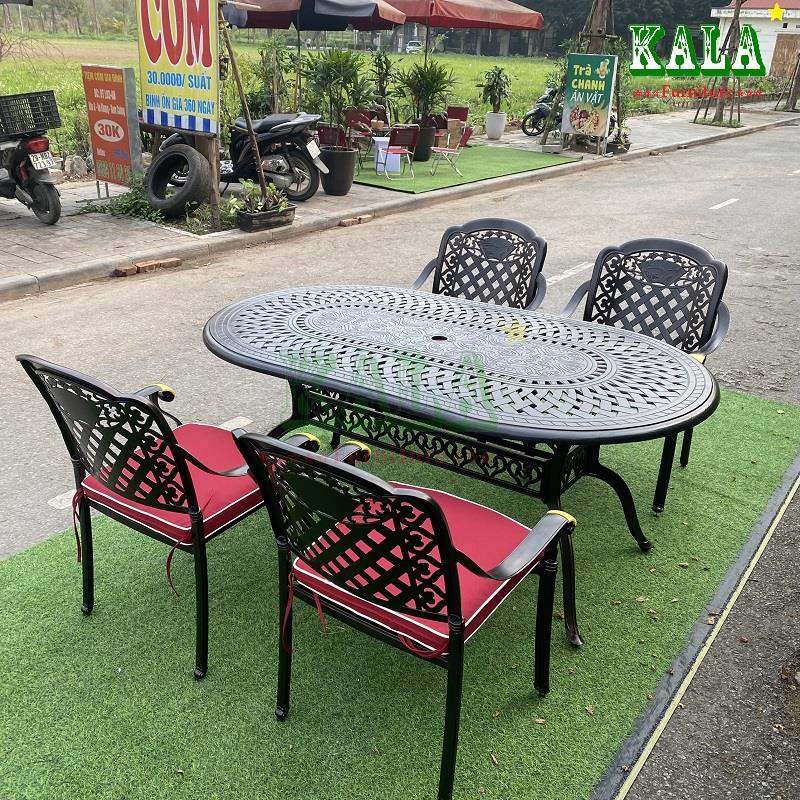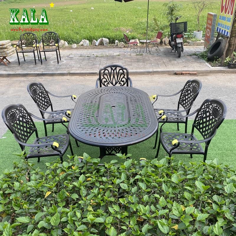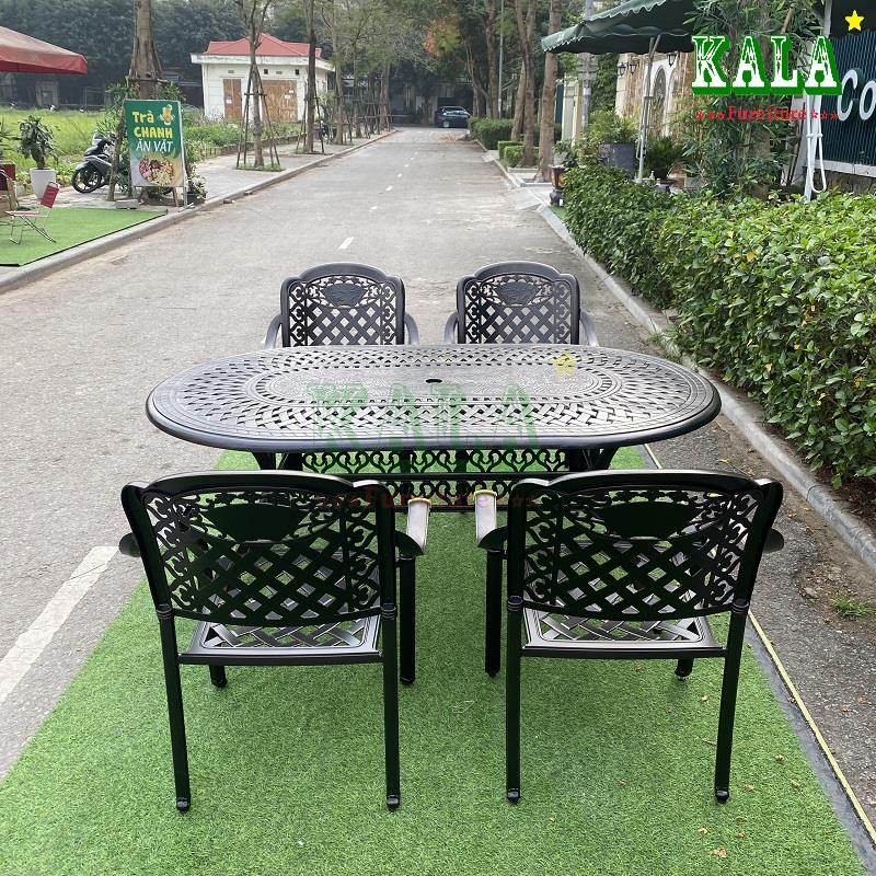 Bàn ghế nhôm đúc NK22 được kết hợp bởi bàn bầu dục 1m8 với ghế nhôm đúc họa tiết quả trám. Bộ bàn ghế có kích thước phù hợp dùng cho ngoài trời, sân vườn gia đình 4 - 6 người. Toàn bộ bàn ghế đều được đúc bằng nhôm với màu đồng đen vô cùng cổ điển sẽ làm cho không gian của bạn trở nên sang trọng, đẹp mắt hơn.