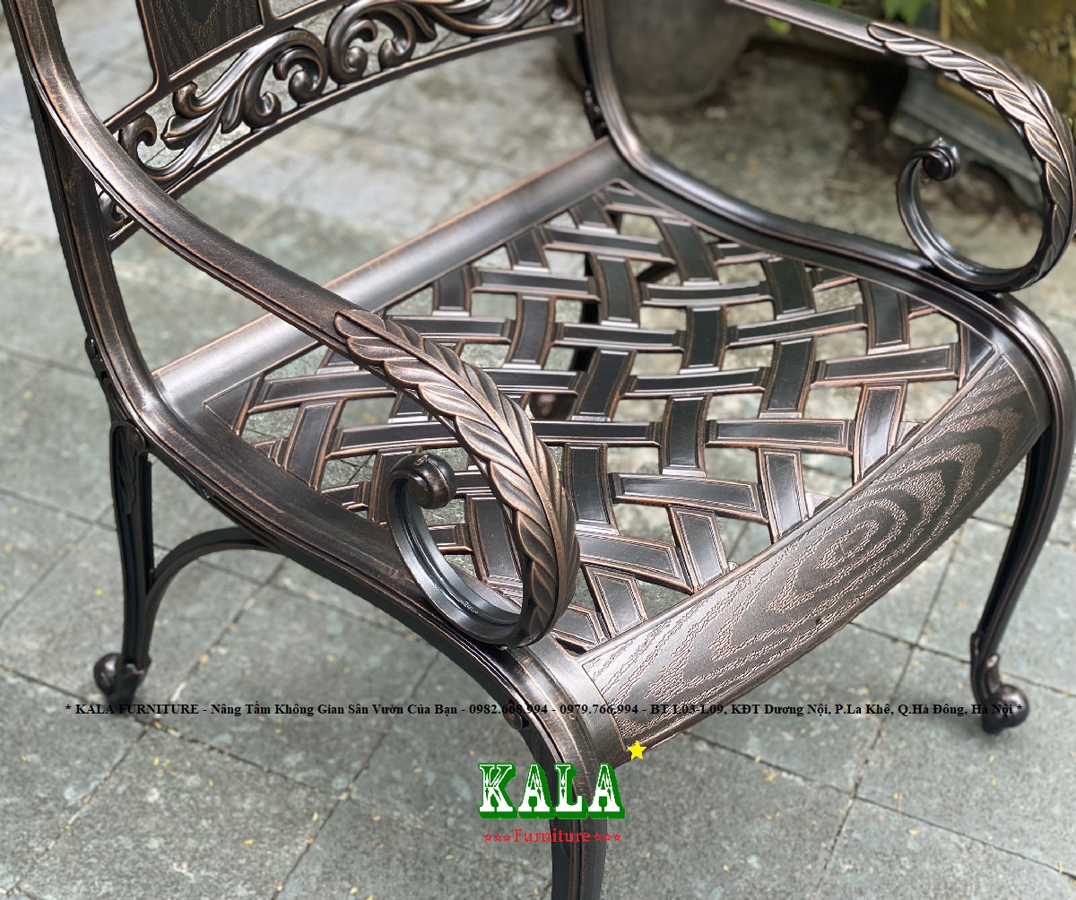 + Ghế nhôm đúc được kết hợp cùng thì có hoạ tiết đơn giản hơn với các đường chéo và hình khối khá hiện đại.