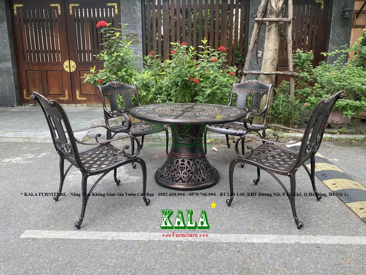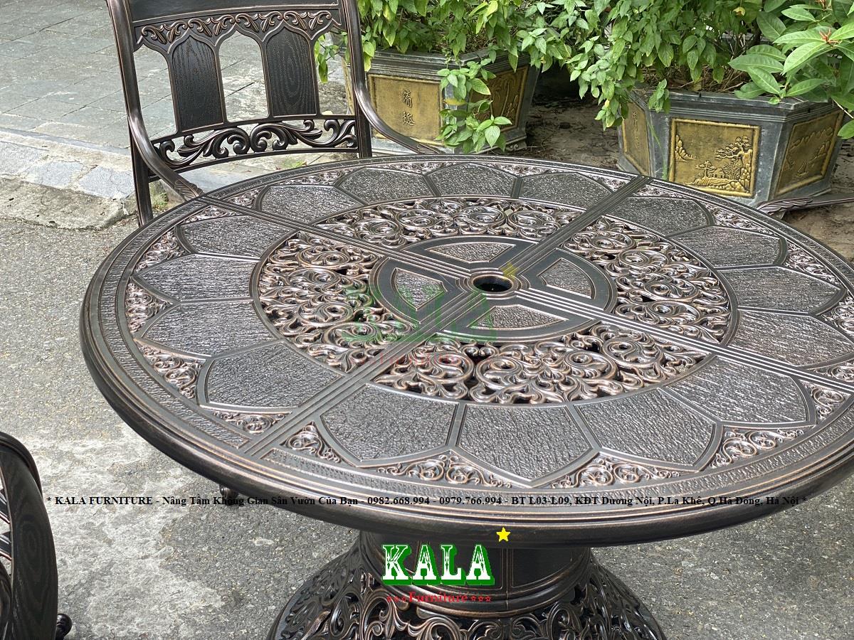 + Bàn nhôm đúc tròn có thiết kế phần chân trụ giống chiếc trống đồng của Việt Nam, kết hợp cùng các hoạ tiết hoa văn cổ điển càng làm bàn ghế trở nên cổ kính, sang trọng hơn.