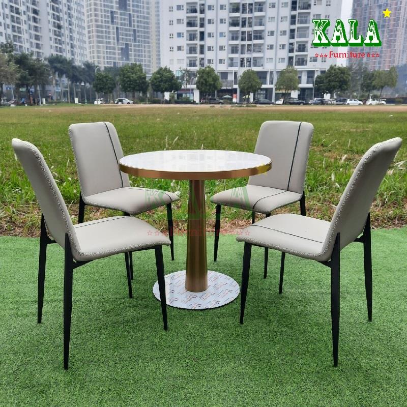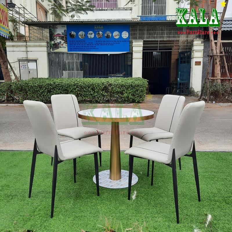 Bộ bàn ghế cafe được nhập khẩu hoàn toàn 100% từ chân bàn, mặt bàn, đến ghế ngồi nên khi ghép với nhau trông rất đồng bộ, sang trọng, hiện đại. Bàn mặt đá tròn 60cm kết hợp cùng chân inox mạ vàng làm cho không gian sáng hơn, nổi bật hơn. Ghế Zena thiết kế đơn giản, đẹp mắt.