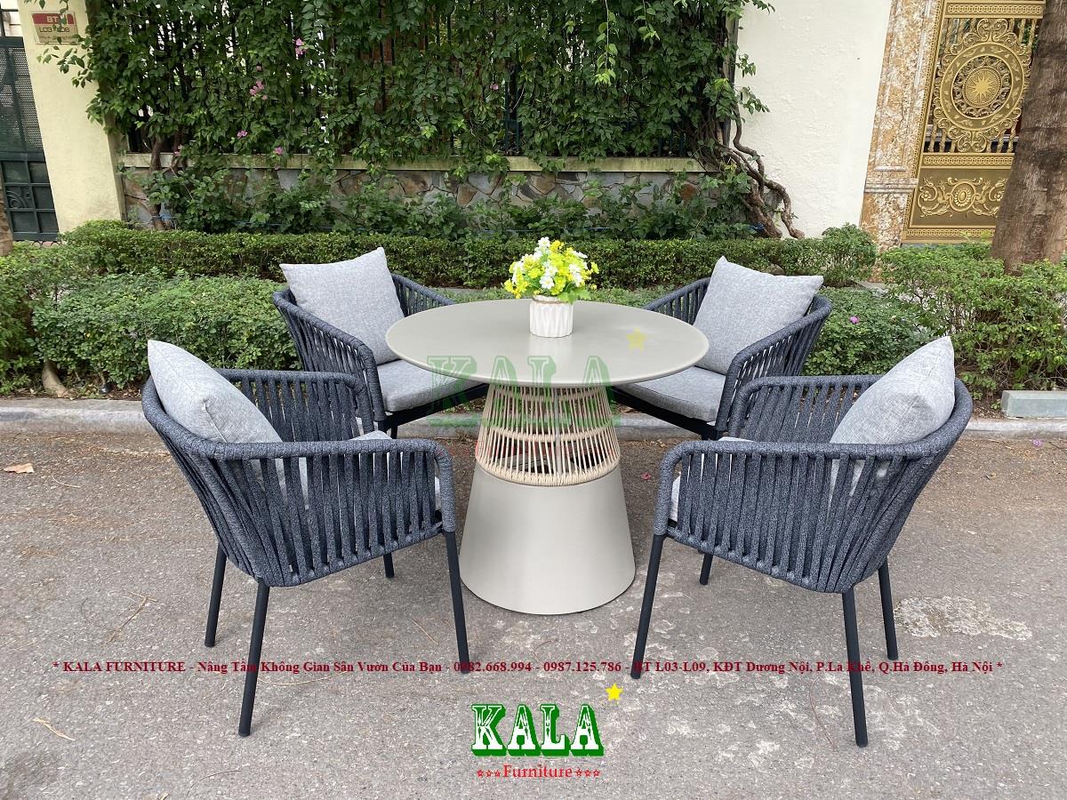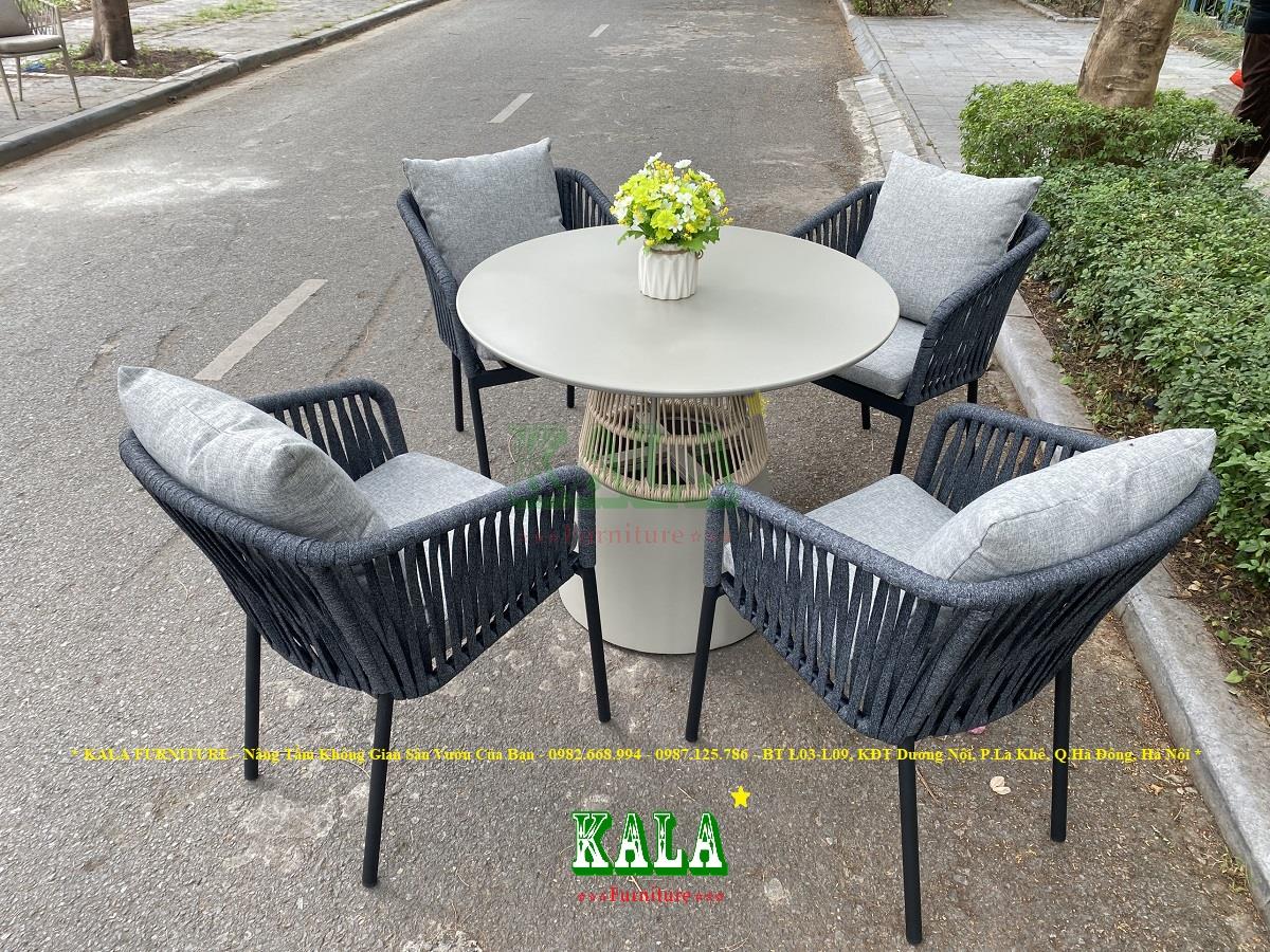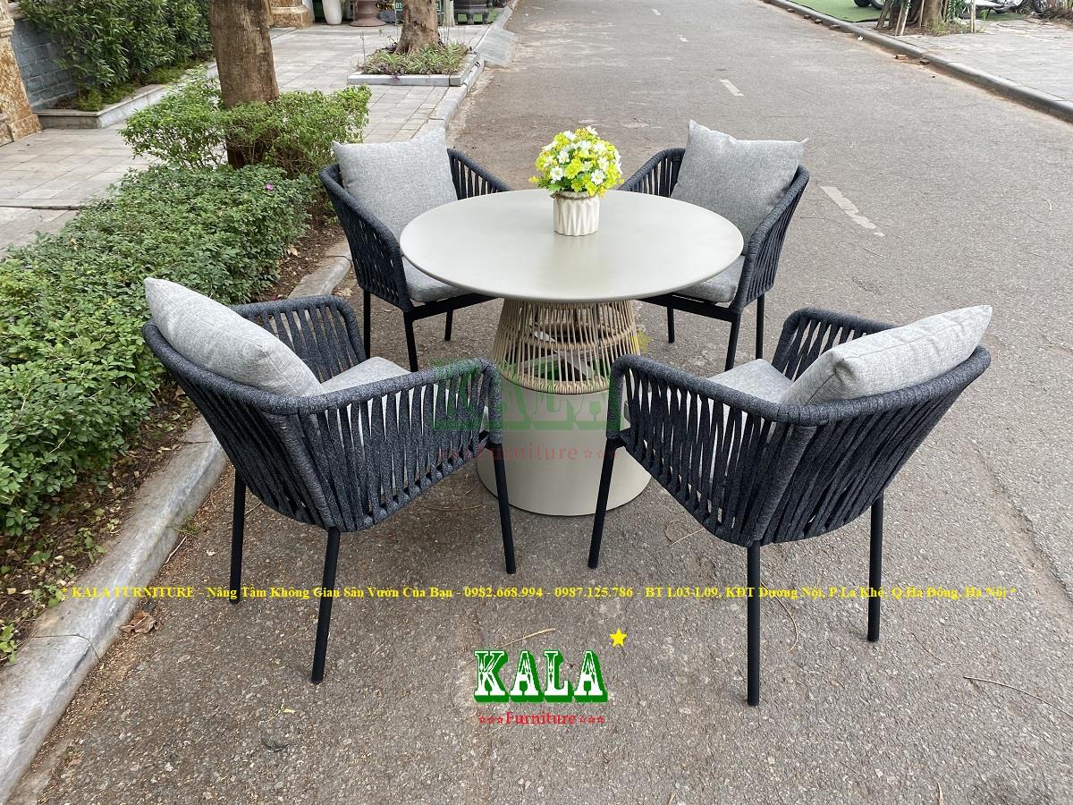 - Bộ bàn ghế khung nhôm dây dù BG-DD06 là mẫu bàn ghế nhôm kiểu mới mang phong cách đơn giản, hiện đại, phù hợp với nhiều không gian, kiểu nhà, kiểu sân vườn khác nhau. Bàn ghế có 2 màu sắc đối lập nhau sẽ làm cho không gian của bạn có điểm nhấn hơn, nổi bật hơn.