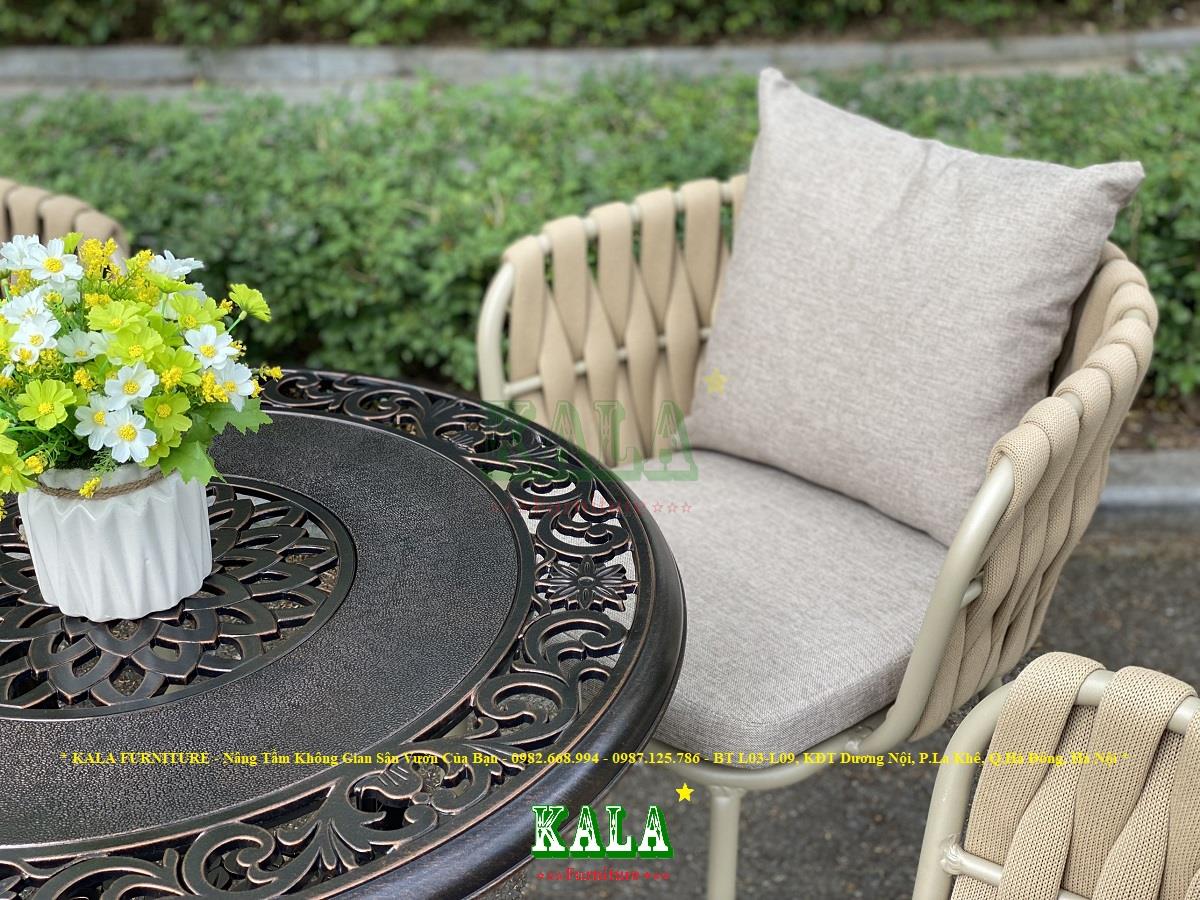 - Bàn được đúc toàn bộ bằng nhôm nên vô cùng cứng cáp, chắc chắn, bên ngoài còn được phủ thêm lớp sơn tĩnh điện để bảo vệ bàn không bị gỉ sét, gãy hỏng, gây mất thẩm mỹ sau khi dùng một thời gian. Bàn nhôm đúc nhưng các chi tiết hoa văn được đúc rất tinh xảo bắt mắt kết hợp với màu đồng của bàn làm cho bộ bàn ghế càng trở nên sang trọng.