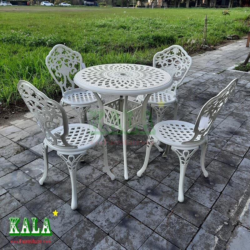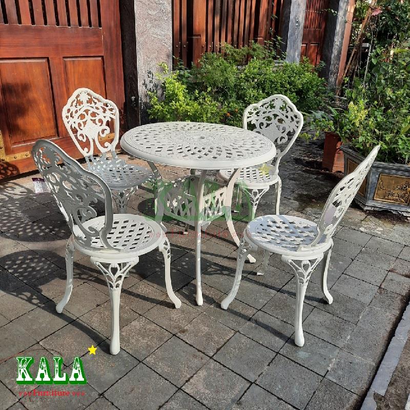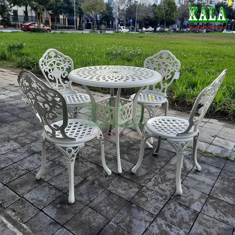 Với không gian sân vườn, ngoài trời thì chất liệu chắc chắn, có độ bền cao là lựa chọn hàng đầu. Bởi với không gian ngoài trời thì nắng mưa hay oxi hóa trong không khí sẽ làm cho bàn ghế nhanh rỉ sét, gãy hỏng. Bộ bàn ghế có các họa tiết bàn ghế đều được làm tỉ mỉ, tinh tế, không thừa các via nhôm thừa do đúc khuôn rất đẹp mắt.
