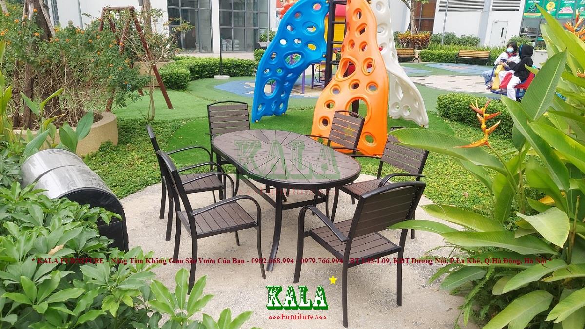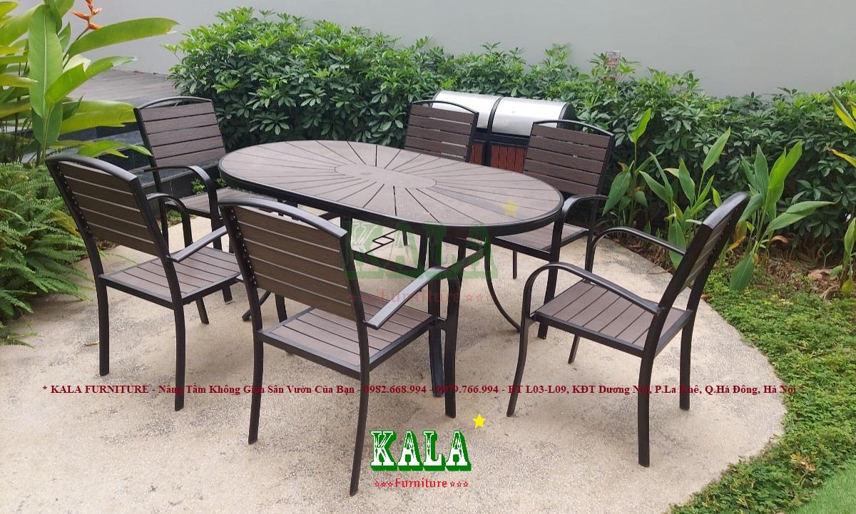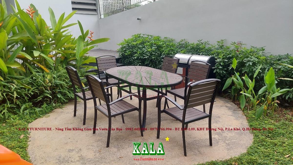 - Phần mặt bàn và ghế được sử dụng bằng các nan polywood ( nhựa giả gỗ) một chất liệu mới có độ bền cao nên rất được ưa chuộng lựa chọn làm vật liệu cho ngoại thất. Các nan polywood có các vân gỗ được in rất tinh xảo.