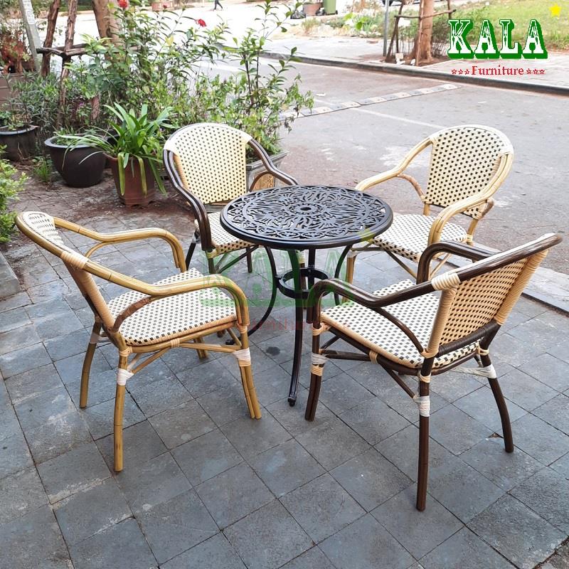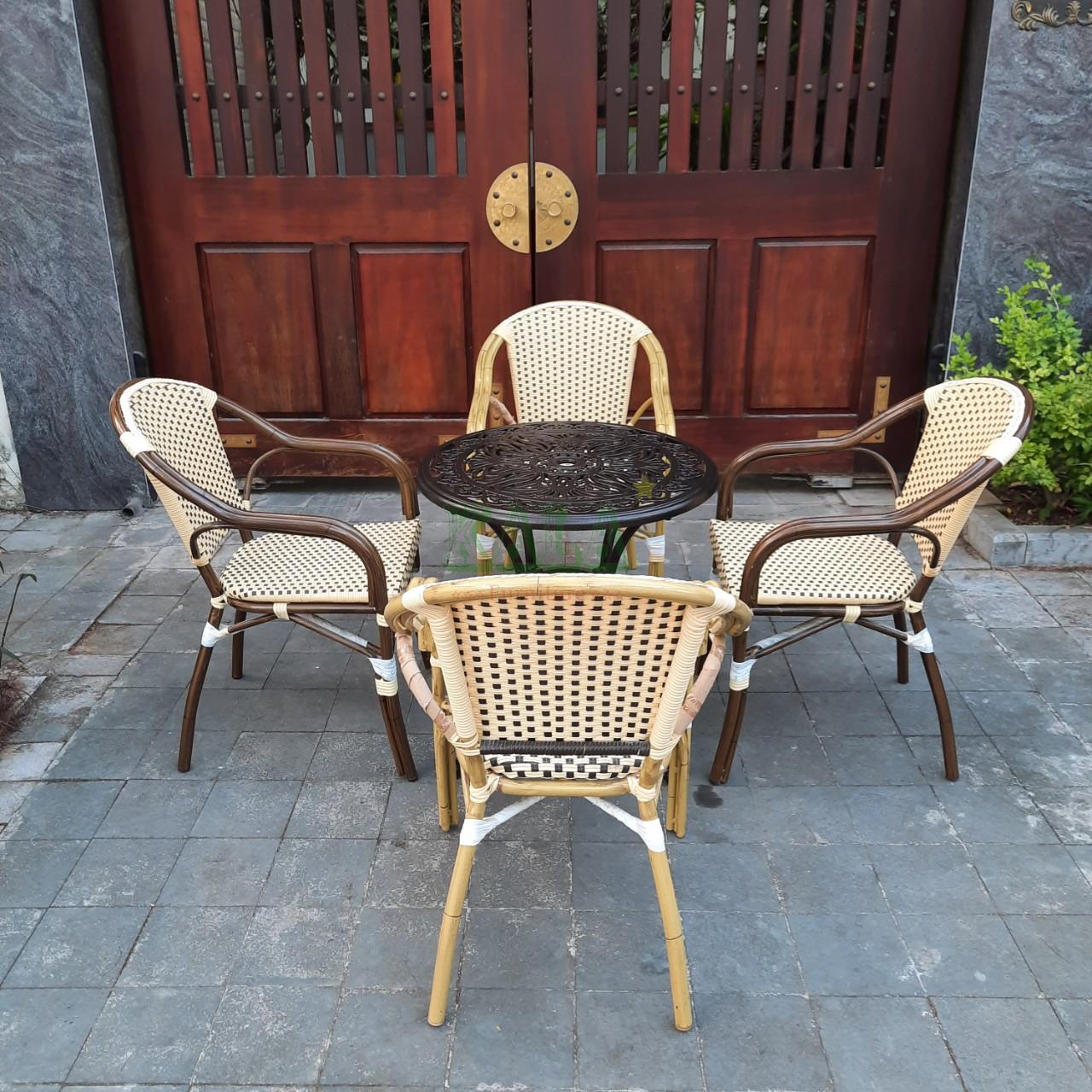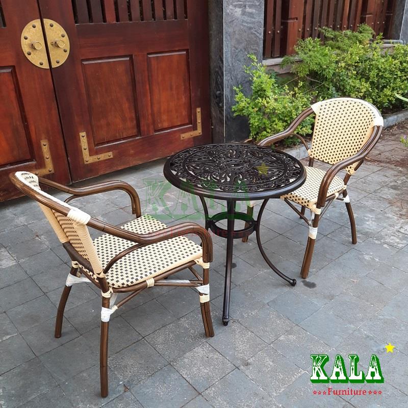Bàn làm bằng nhôm đúc sơn tĩnh, ghế khung nhôm sợi mây nên dù để ngoài trời có mái che hay không thì vẫn rất bền, không lo bị rỉ sét hay gãy,... Bàn có họa tiết văn tinh tế, sang trọng, ghế đơn giản, màu sắc sáng làm cân bằng tổng thể toàn bộ bàn ghế.
