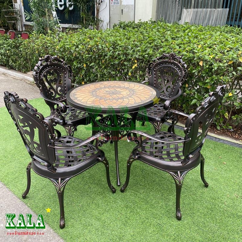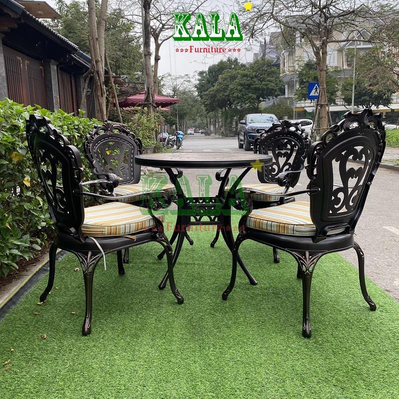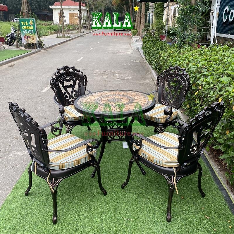 Bộ bàn ghế nhôm đúc dùng cho sân vườn vô cùng bền bởi được làm bằng chất liệu nhôm đúc mặt bàn đá. Ghế cũng được làm bằng nhôm đúc với họa tiết tinh tế, có phần để tay để tạo tư thế ngồi thoải mái cho người dùng.