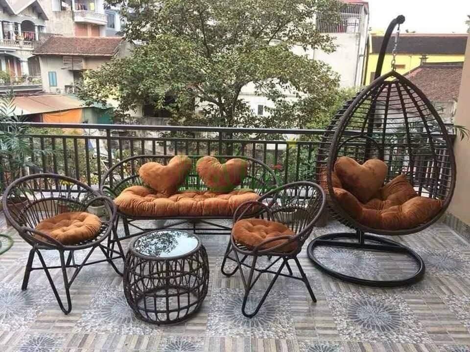 Bộ mây nhựa cho sân vườn, ban công gồm một bàn, hai ghế, một ghế dài và một xích đu nên có diện khá nhỏ phù hợp cho cả những nhà ống trong thành phố hay mẫu nhà chung cư. Được làm toàn bộ bằng mây nhựa nên vừa có cảm giác hòa quyện với thiên nhiên, vừa có độ bền cao khi để ngoài trời.
