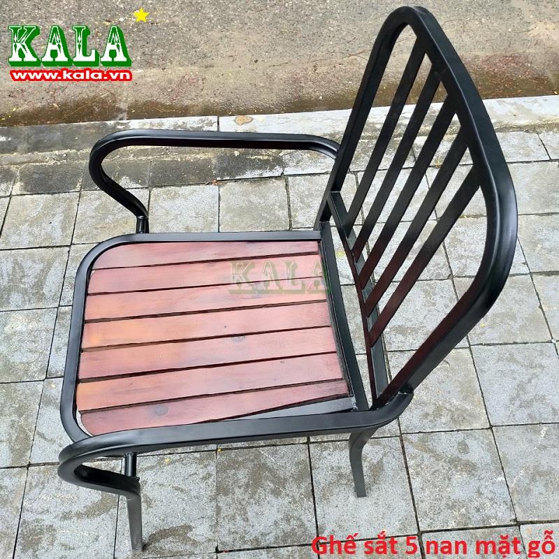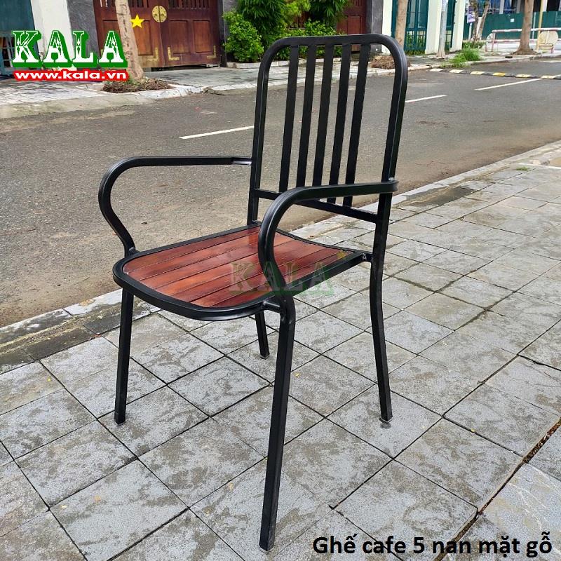 Ghế cafe 5 nan mặt gỗ là mẫu ghế được làm bằng khung sắt được sơn tĩnh điện kết hợp với phần mặt ngồi được làm bằng gỗ rất chắc chắn nên thường được mọi người dùng trong quán cafe, quán ăn nhà hàng, bàn ghế nơi sân vườn.