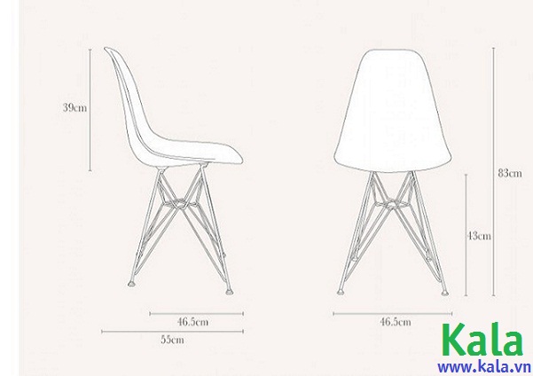 Ảnh 1: Kích thước (DxRxC) của Ghế Eames DSW chân sắt: 46.5x55x83 cm.