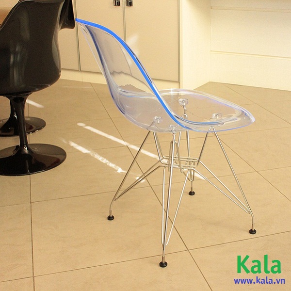 Ghế Eames DSR Clear chân sắt với Chất liệu nhựa trong suốt không những không cản ánh sáng mà ngược lại, chúng giúp cho ánh sáng được hắt qua & trở nên lung linh hơn, bạn có thể nhìn xuyên qua ghế ở bất kì góc độ nào để thấy các vật dụng khác xung quanh nhờ đó mà sự hiện diện của những chiếc ghế làm cho căn phòng của bạn trở nên nội bật nhất.
