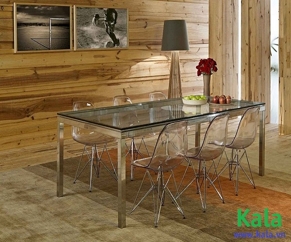 Ghế Eames DSR Clear chân sắt với Chất liệu nhựa trong suốt không những không cản ánh sáng mà ngược lại, chúng giúp cho ánh sáng được hắt qua & trở nên lung linh hơn, bạn có thể nhìn xuyên qua ghế ở bất kì góc độ nào để thấy các vật dụng khác xung quanh nhờ đó mà sự hiện diện của những chiếc ghế không hề làm cho căn phòng của bạn trở nên chật hơn. Bàn ghế phòng ăn