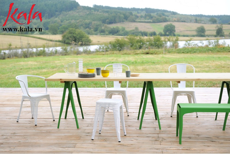 Ghế Đôn Tolix với kiểu dáng phong trần khi kết hợp với không gian ngoài hành lang, lối, ban công tạo nên vẻ cuốn hút hơn bao giờ hết và ghế có thể chịu nắng mưa hay những thời tiết khác nhiệt rất tốt bền đẹp với thời gian. Bàn ghế phòng ăn