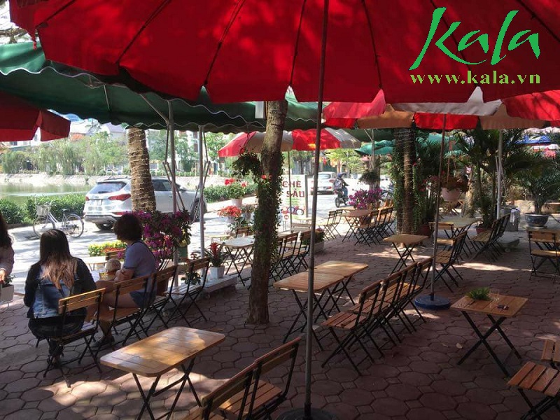 Ảnh 11: Ghế dù vải cafe với nhiều mắc sắc như: Xanh rểu, Xanh dương, đỏ đô, nâu cafe, đen. Dễ dàng kết hết hợp với nhiều không gian theo ý bạn muốn rất tiện lợi. Hơn nữa bàn ghế còn có thể xếp gọn rất phù hợp dùng ngoài vỉa hè.