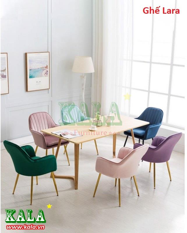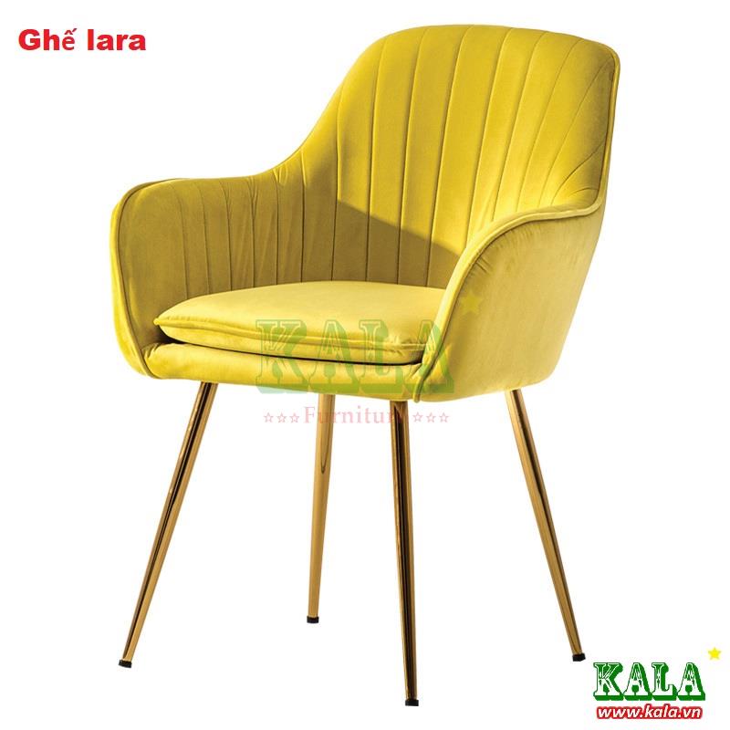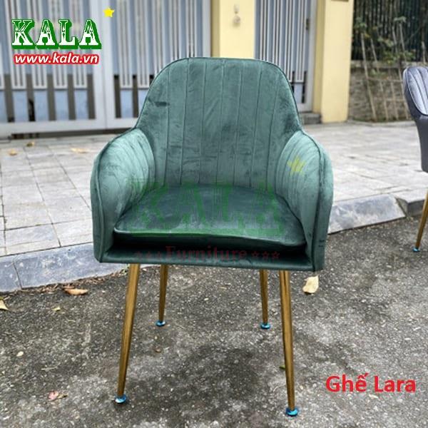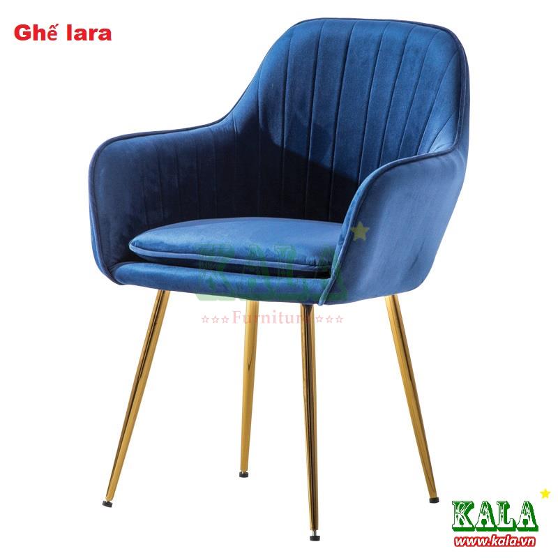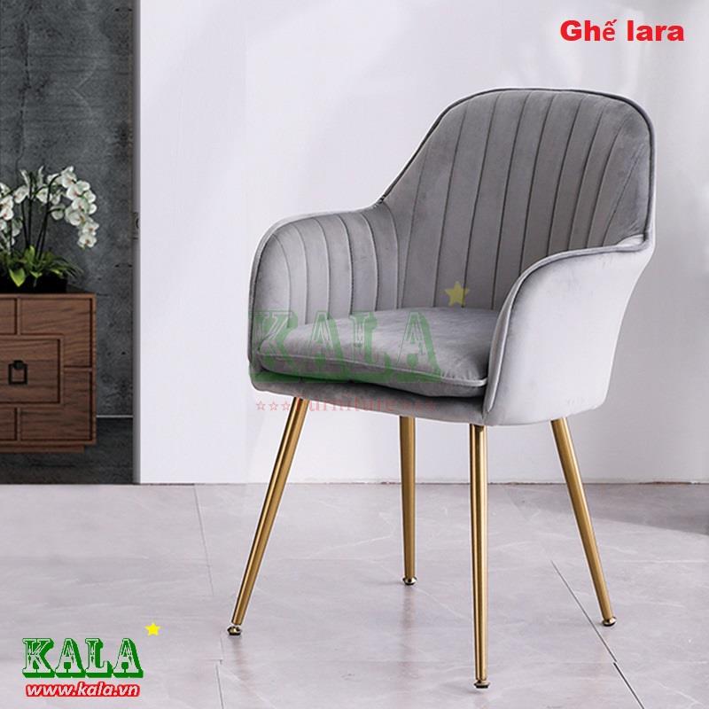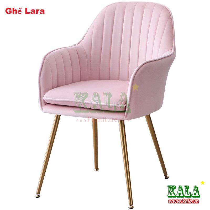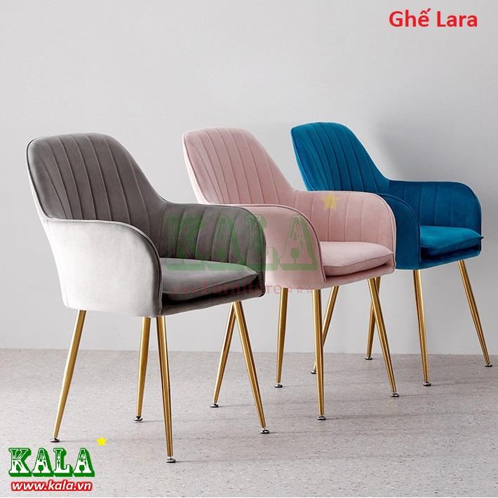Mẫu ghế cũng được ưa chuộng không kém mẫu ghế Monet thì phải nhắc đến ghế Lara, Ghế lara thì được làm vải nỉ, nhung nên khi ngồi tay hay thân người tiếp xúc vào ghế đều cảm nhận được sự mềm mại của vải nhung và êm ái của độ dày dặn. Điểm làm cho ghế lara nổi bật thì phải nhắc đến là chân ghế. Chân ghế được mạ PVC bóng loáng như trang sức, làm cho ghế trở nên hiện đại hơn, sang trọng hơn.
