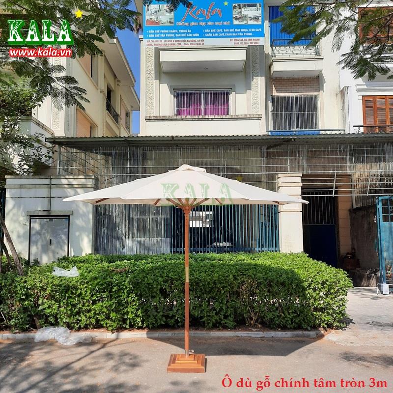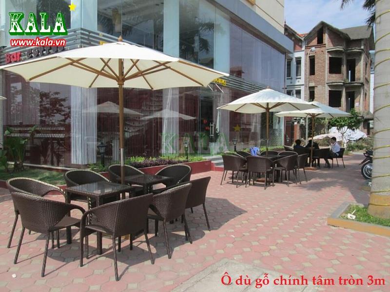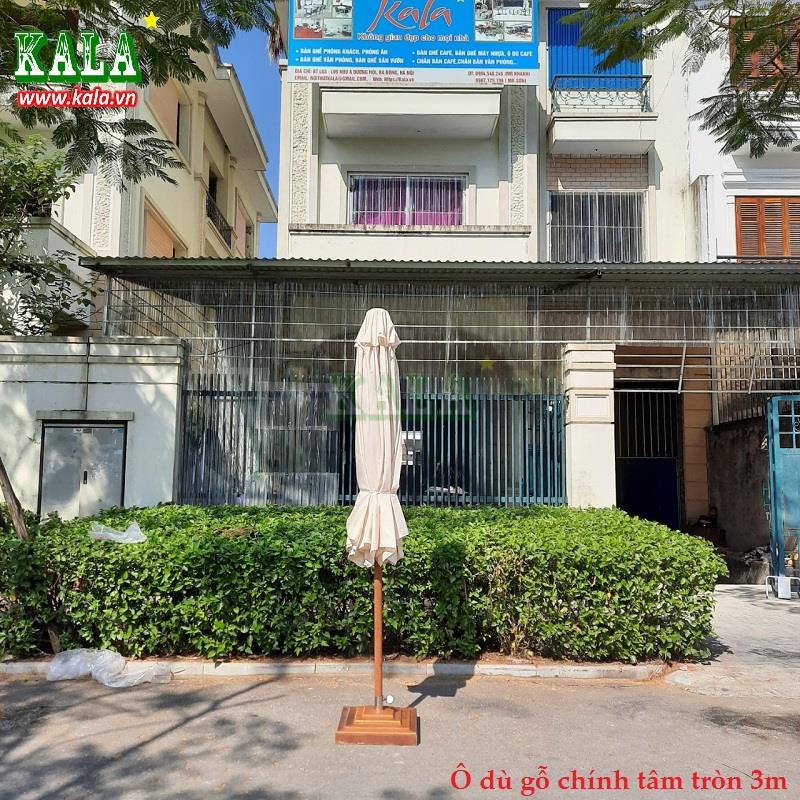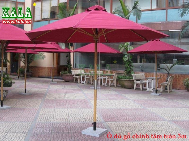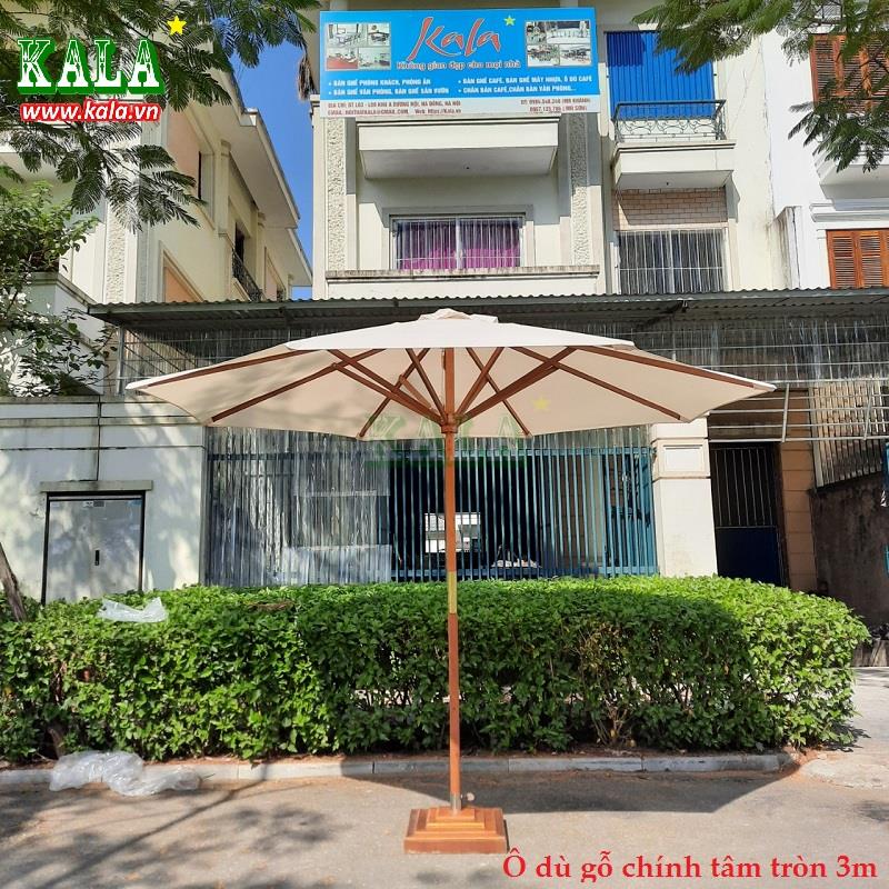 Ô dù gỗ chính tâm có đường kính tròn 3m với phần khung được làm bằng gỗ tự nhiên kết hợp với đế được làm bằng bê tông bọc gỗ hay đế được làm bằng đá rất chắc chắn cùng với đó áo ô được làm bằng vải có độ bền cao chịu nắng mưa rất tốt. Ô thường dùng che mưa che nắng trong những quán cafe, sảnh chung cư, sân vườn đều rất phù hợp.