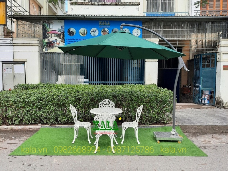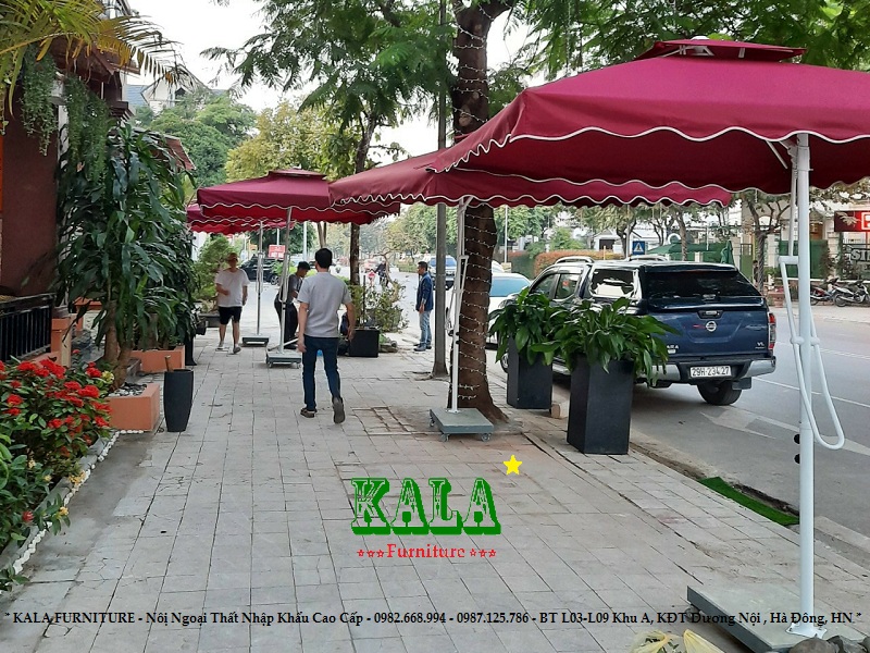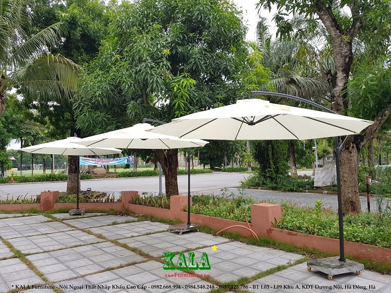 KALA xin giới thiệu tới quý khách hàng những mẫu ô dù ngoài trời đang được nhiều quán cafe, nhà hàng, quá ăn, khu nghỉ dưỡng, resort sử dụng nhiều nhất hiện nay đặc biệt là những mẫu Ô dù lệch tâm ( tức cán ô nằm bên cạnh của ô ) được nhiều người sử dụng nhất hiện nay. Vì khi sử dụng diện tích sẽ được sử dụng được nhiều hơn ô chính tâm và cũng không bị vướng trong quá trình sử dụng giúp quý khách ngồi thư giãn thoải mái hơn. và thường những màu áo Ô KALA cung cấp là màu xanh rêu, đỏ đô, trắng...