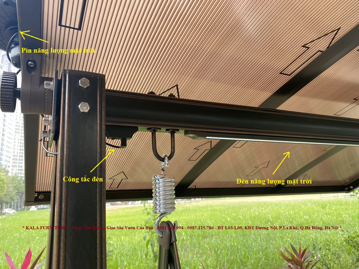 Xích đu 2 chỗ mái che năng lượng mặt trời có tích hợp cùng đèn chiếu sáng ngay trong xích đu vô cùng mới mẻ, hiện đại. Khung xích đu được làm bằng khung nhôm sơn tĩnh rất cứng cáp, chắc chắn phù hợp dùng ngoài trời không bị rỉ sét, gãy hỏng.